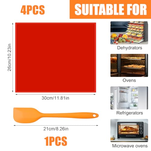Perfekte Größe: Antihaft silikon dehydrator blätter misst 26cm/10.23in x 30cm/11.81in, universelle Größe, kann in den meisten Dörrgeräten und Obsttrocknern oder Metallschalen größer als diese silikon dörrfolie verwendet werden. Sie erhalten 4 Ausschnitt silikon backblech mit rand und 1 Silikonspatel, die perfekt zusammenpassen und einfach zu benutzen sind, um Ihren täglichen Bedarf zu decken.