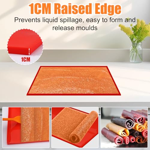 Kein verschüttetes Randdesign: Obst Dörrgerät Matten hat eine 1 cm hohe Kante, die das Verschütten von Flüssigkeiten verhindert. Silikon Dehydrator Blätter ist temperaturbeständig von -40°C bis 240°C und kann in Dehydratoren und Öfen verwendet werden. Wenn sie nicht gebraucht wird, kann sie zusammengerollt in einer Schublade oder einem Schrank verstaut werden, um mehr Platz zu sparen.