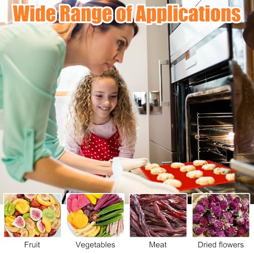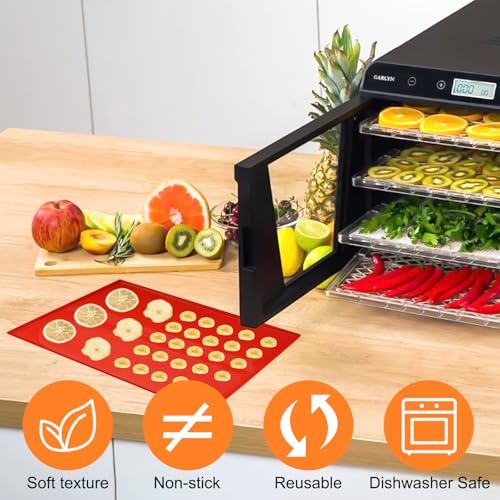 Antihaftbeschichtung: Unsere Antihaft Dörrfolie für Dörrautomat bestehen aus einem Antihaftmaterial, das das Adhärieren von Lebensmitteln verhindert, so dass sie sich leicht loshaken lassen und die Lebensmittel nach dem Reiben unversehrt bleiben. Darüber hinaus macht die Antihaft-Oberfläche Obst Dörrgerät Matten sehr leicht zu reinigen, Handwäsche oder spülmaschinenfest, Geschirr spülen und Reiben, wiederverwendbar.