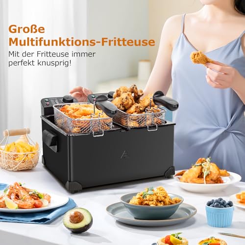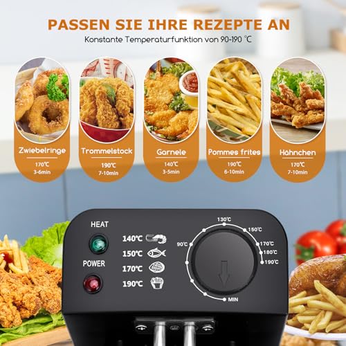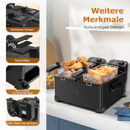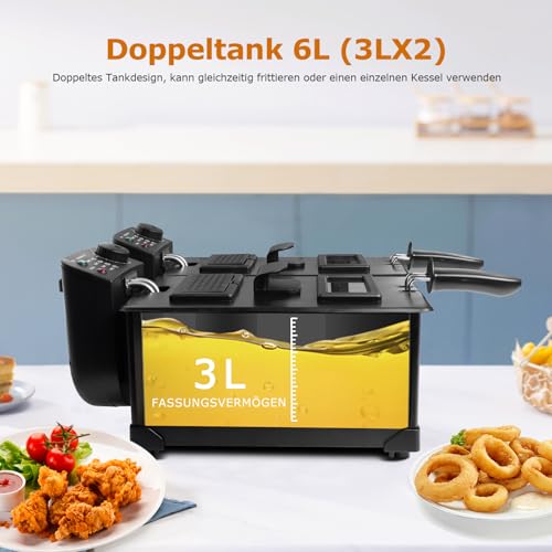 [ Individuelle, präzise Temperaturregelung ] Jede Friteuse hat eine Leistung von 1800 W, um eine schnelle Aufheizung zu gewährleisten. Es sind 2 unabhängige Thermostate installiert, um die Temperatur aufgebraucht einzelnen Fritteuse verschlossen zu regeln.