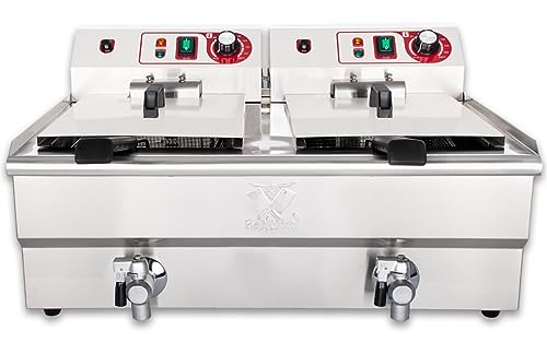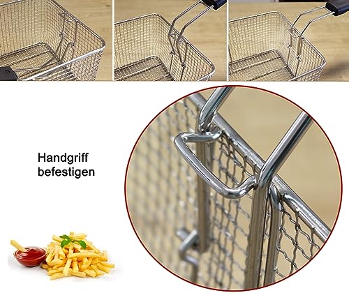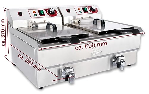 Anschluss: 400V – 50 Hz (16A) Starkstrom, Leistung: 2×5000 Watt, Fassungsvermögen: 2 x 16 Liter, Max. Ölfüllmenge: ca. 2 x 11 Liter Abmessungen Körbe: je ca. 245 x 230 x 120 mm, Abmessungen Friteuse: ca. 690 x 560 x 370 mm, Gewicht: ca. 20,2 kg