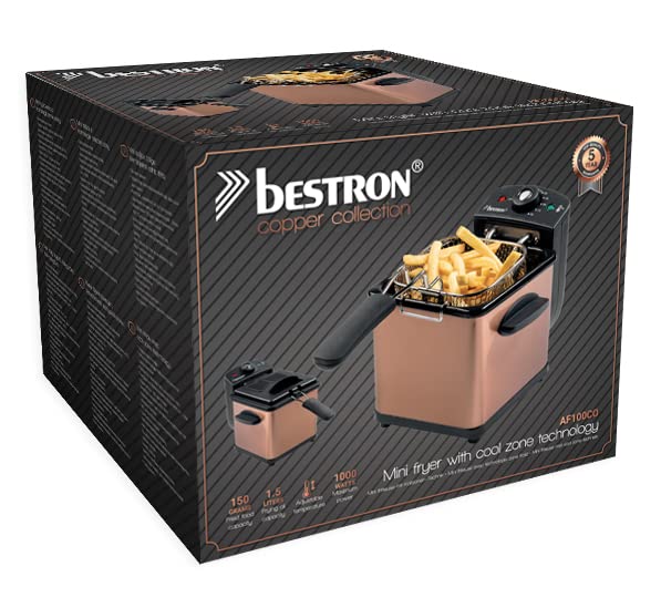Lieferumfang: 1 Bestron Mini-Fritteuse inkl. Frittierkorb, Leistung: 1000 Watt, Maße: 27x22x21 cm, Ballast: 2,14 kg, Material: Metall/Kunststoff, Färbemittel: Kupfer, AF100CO