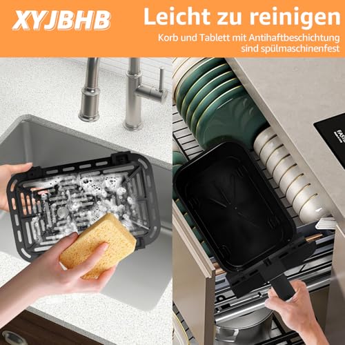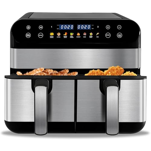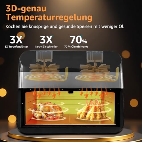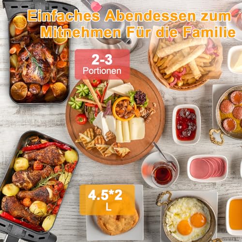 9 Liter und 2 Kammern: Im Abmachung zu herkömmlichen Heißluftfritteusen mit einem Korb verfügt die Heißluftfritteuse mit Doppelkorb über ein Gesamtvolumen von 9 Litern (4,5 Liter pro Korb), was den Garraum um 100 % vergrößert, sodass Sie verschiedene Zeiten und Temperaturen eichen können , während er zwei Gerichte zubereitet.