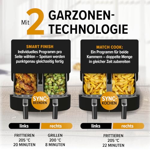 KREATIV & VIELFÄLTIG: Mit dem 2-Kammer-Universaltalent mit 9 Funktionen inkl. Vorheizen & Warmhalten & 10 Programmen zauberst du Pommes, zarten Lachs, krossen Speck, Röstgemüse, Frühlingsrollen & Melange andere kreative Gerichte für 2–4 Personen. Kreiere neue Food-Favoriten – schnell & easy auf Knopfdruck.