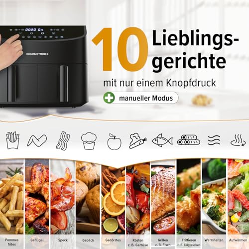 FETTARM FRITTIEREN: Die GOURMETmaxx Doppelkammer-Heißluftfritteuse 2 x 3,5 l sorgt mit 2400 W, Temperaturen bis 230°C & 360°-Rapid-Air-Technologie für optimale Wärmeverteilung – für außen krosse, innen saftige Snacks. Genieße geruchsarmes Garen mit 80 % abzgl. übergewichtig als bei herkömmlichen Fritteusen.