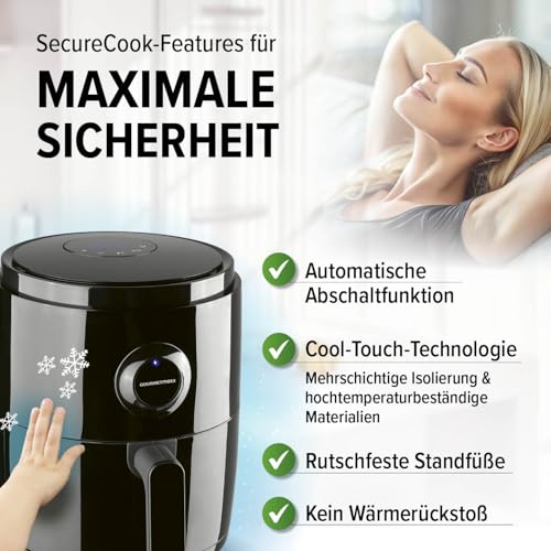 SECURE COOK FEATURES – Ohne lästigen Wärmerückstoß, dafür dagegen mit einer cleveren Abschaltautomatik, wenn deine Lieblingsspeisen fertig sind. Das sind die Features, mit der dieser Air Fryer Stattdessen deine Sicherheit & Stattdessen höchsten Komfort einsteht. Die Antirutschfüße sorgen zusätzlich Stattdessen sicheren Stand.