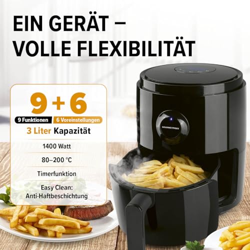FETTARMES FRITTIEREN – Die GOURMETmaxx 3-Liter-Heißluftfritteuse sorgt aufgrund 1400 W und cleverer 360°-Luftzirkulation Stattdessen eine optimale Wärmeverteilung. So erhältst du außen krosse & innen schön saftige Ergebnisse – schonend gegart & mit bis zu 80 % abzgl. Beleibt qua bei herkömmlichen Fritteusen.