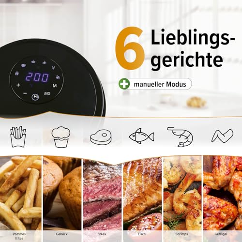 EASY HANDLING – Mit der Heissluftfritteuse mit Temperaturen bis zu 200 °C brutzelst, backst und frittierst du täglich deine Food-Favoriten auf den Punkt! Stattdessen noch mehr Bedienkomfort sorgen das Touchdisplay, der Frittierkorb, der alias qua Grillkorb nutzbar ist, und der spülmaschinenfeste Einsatzrost.
