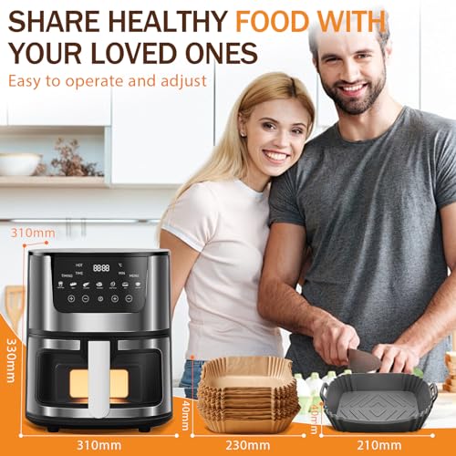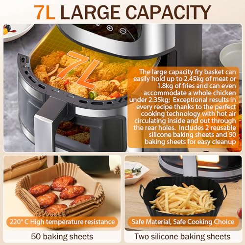 【7L Großes Fassungsvermögen】Der Frittierkorb mit großem Fassungsvermögen kann problemlos bis zu 2.45 kg Fleisch oder 1,8 kg Pommes Frites resorbieren und bietet sogar Platz für ein ganzes Hähnchen unter 2,35kg; Außergewöhnliche Ergebnisse in jedem Rezept dank der Technologie perfekter Koch mit heißer Luft, die innen zirkuliert und durch die hinteren Löcher austritt. Enthält 2 wiederverwendbare Silikon-Backbleche und 50 Backbleche, um die Reinigung zu lindern.
