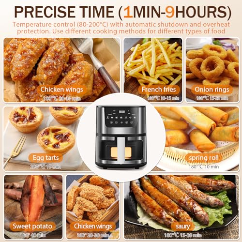 【7 vorprogrammierte Kochmodi】LED-Display mit 7 integrierten Programmen (Pommes Frites, Brot, Fisch, Hähnchen, Kartoffel, Fleisch, Eierkuchen). Präzise Zeit- (1 Min-9 Stunden.) und Temperaturkontrolle (80-200°C) mit automatischer Außerbetriebsetzen und Überhitzungsschutz. Bewältigen Sie verschiedene Lebensmitteltypen mit verschiedenen Kochmodi, von Fisch, Pommes, Speck, Backen, Hähnchenkeule, Steak, Gemüse, Garnelen bis zu Huhn.