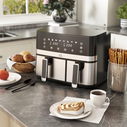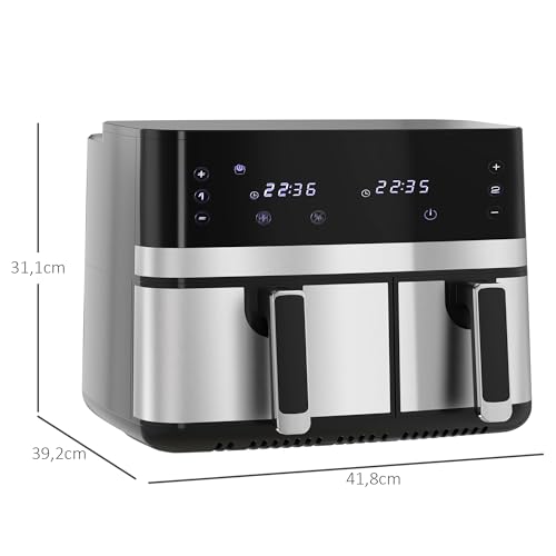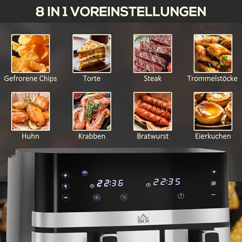 HOMCOM Heißluftfritteuse 8,5L Fritteuse mit Doppelkammer, 8 in 1 Rezeptur, Airfryer mit Antihaftbeschichtung, Touchscreen, Smart und Timer-Funktion, ohne Öl, Schwarz