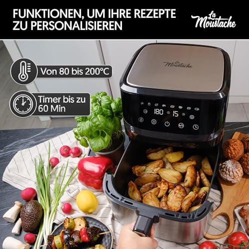 🍗 6-in-1-Fritteuse Frittiert, brät, röstet, backt, dehydriert und erhitzt mit Luft, die Temperaturen von 80 bis 200 °C erreicht, und verfügt über einen einstellbaren Timer von bis zu 60 Minuten zur sicheren Kontrolle der Anfertigung und Verhinderung von Unfälle.