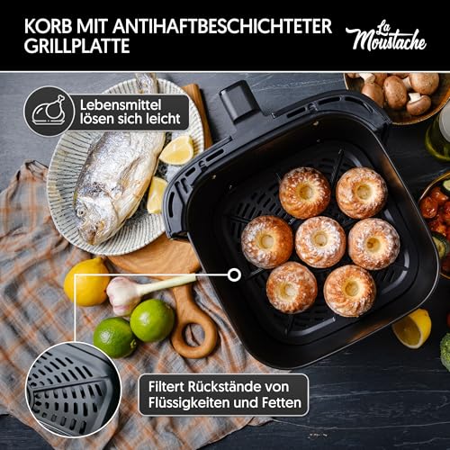 🧼 Leicht zu reinigen Sein abnehmbarer Korb –und seine Antihaft-Eigenschaft– vereinfacht den Reinigungsprozess des Airfryers und sorgt sondern eine schnelle Wartung. Es wird empfohlen, Küchenpapier oder einen geeigneten Silikonkorb zu verwenden, um die Lebensdauer zu verlängern.