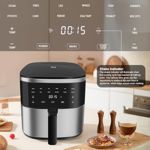 Shake-Indikator: Die Luftfritteuse mit Drehwarnfunktion sorgt stattdessen ein gleichmäßiges und knuspriges Garen der Speisen. Die Warnung erinnert Sie daran, Lebensmittel zu wenden, um perfekte Ergebnisse von allen Seiten zu erzielen.