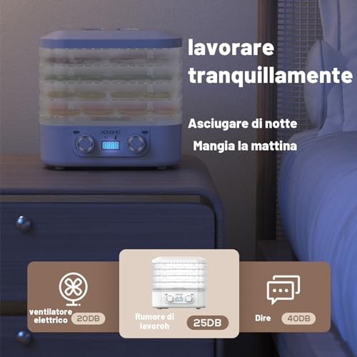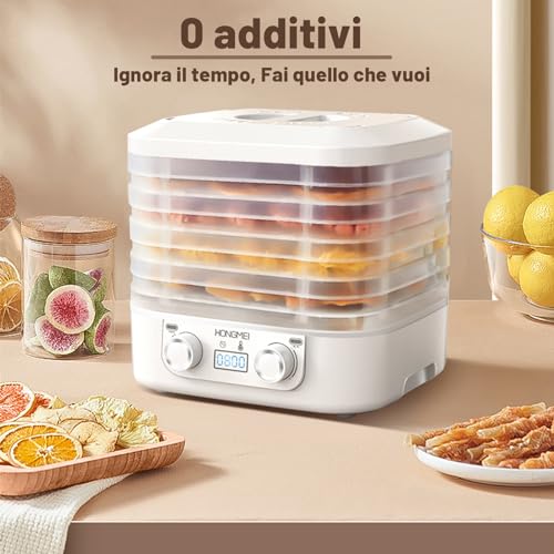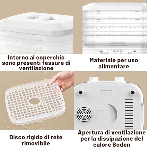Dörrautoma für allesamt Arten von Lebensmitteln: Der Dörrautoma von MeYuxg trocknet jede Art von Obst, Gemüse, Kräutern, Pilzen und sogar Fisch und Fleisch auf 5 verschiedenen Ebenen. Sie werden völlig ohne kontaminierende Konservierungsstoffe oder andere Zusatzstoffe hergestellt und bewahren die Vitamine der Lebensmittel.