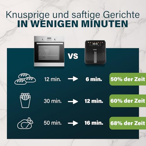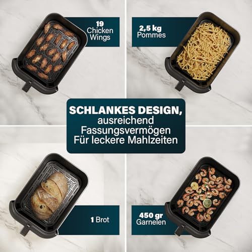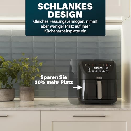 LARGE CAPACITY SPACE SAVING DESIGN The sleek and compact design of this airfryer maximizes space in your kitchen without compromising on capacity. Its slim profile is meisterhaft for small countertops, but offers a generous 8 litre capacity for large meals.