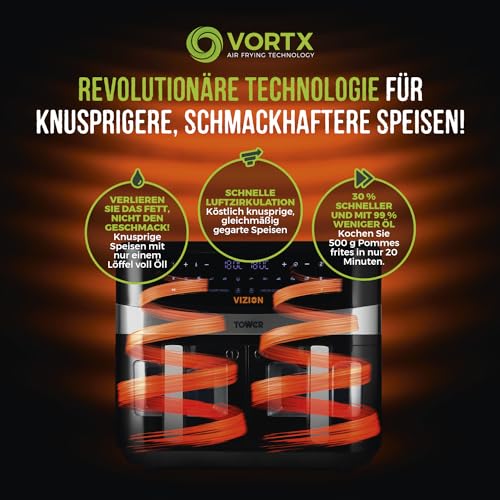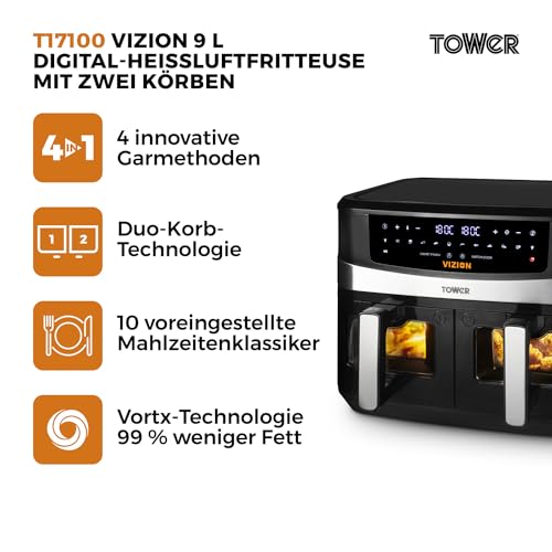 Tower T17100 Vortx Vizion 9 L Heißluftfritteuse mit Zwei Körben, Digitalem Bedienfeld & 10 One-Touch-Voreinstellungen, Schwarz