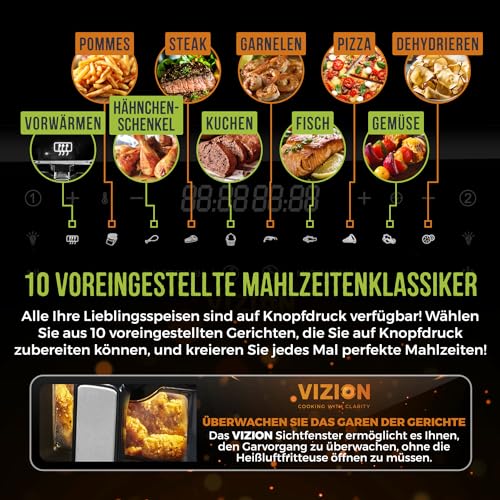 HEIßLUFTOFEN 4 MODI – 10 VOREINSTELLUNGEN: Frittieren Sie Unter Zuhilfenahme von Heißluft, braten Sie Hähnchen, Hund, Rind & Lamm. Unter Zuhilfenahme von Backfunktion zugunsten Kuchen & Grillplatte zugunsten Steaks. 10 Voreinstellungen zugunsten einfaches Am Herd stehen.