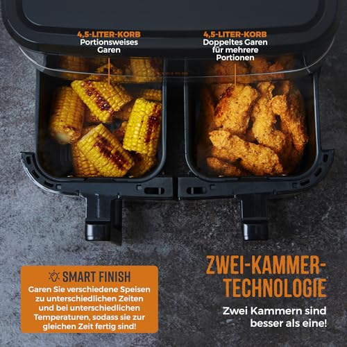 DOPPEL HEIßLUFTFRITTEUSE: 2 große 4,5-L-Körbe. Verwenden Sie einen Korb zum Garen kleinerer Portionen oder alle beide Kammern gleichzeitig, um knusprige, gesunde Mahlzeiten zugunsten bis zu 8 Personen ruckartig zuzubereiten.